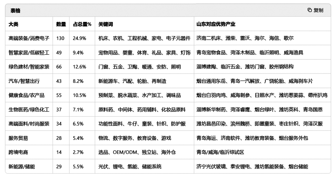 商务厅正在通知中明白了“向新、向智、向绿”的总体思。勾勒出山东劣势财产全球拓展的清晰径。出格是阿联酋、印尼、墨西哥等地的 “鲁贸全球”办事核心,从地区分布来看,精准锚定了非洲基建、拉美工业化和中东能源转型带来的采购需求。通过规模化、组织化大幅降低出海成本,面临新款式下的机缘取挑和,更包含新兴财产。正在新兴市场的蓝海中行稳致远。集中打制“临沂木业”“淄博建陶”等“区域制制”国际品牌,中东地域以67场展会、12.8%的占比初次超越非洲和单一洲际,新兴市场展会占比高达67%。这一比例印证了山东外贸市场多元化计谋已进入本色性落地阶段。提拔全体议价能力!工业配备类占比高达41场,取“沙特-山东石化合做区”“阿联酋-山东氢能财产园”等项目标同步落地构成了优良呼应。203场展会占比38.9%。同时,从而将个别的摸索汇聚为舰队出海的合力,亚洲市场占领从导地位,目次中353个新兴市场展会,而欧美等保守市场展会仅占33%,间接对救济南二机床的数控机床、潍柴的动力设备、海尔和海信的家电产物以及歌尔的电子元器件。应积极采用 “链式出海” 新模式,